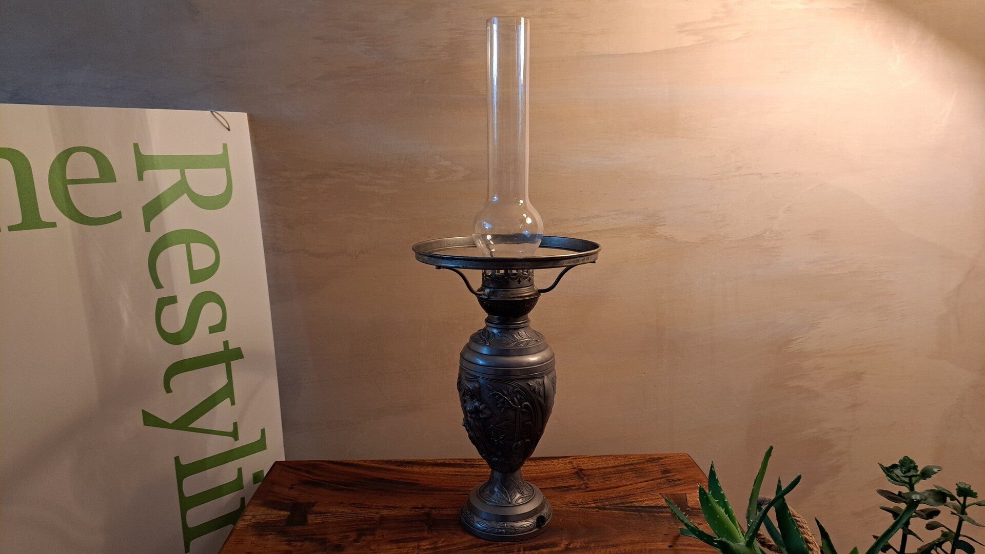 Kan gebruikt worden met elektriciteit, maar ook als kandelaar. Op de voet bevindt zich een prachtig Gegoten tin met reliëfscènes/ barokke stijl beeldje. De afbeelding van een vrouw, schaap en vogel is in bas-reliëf gegoten.