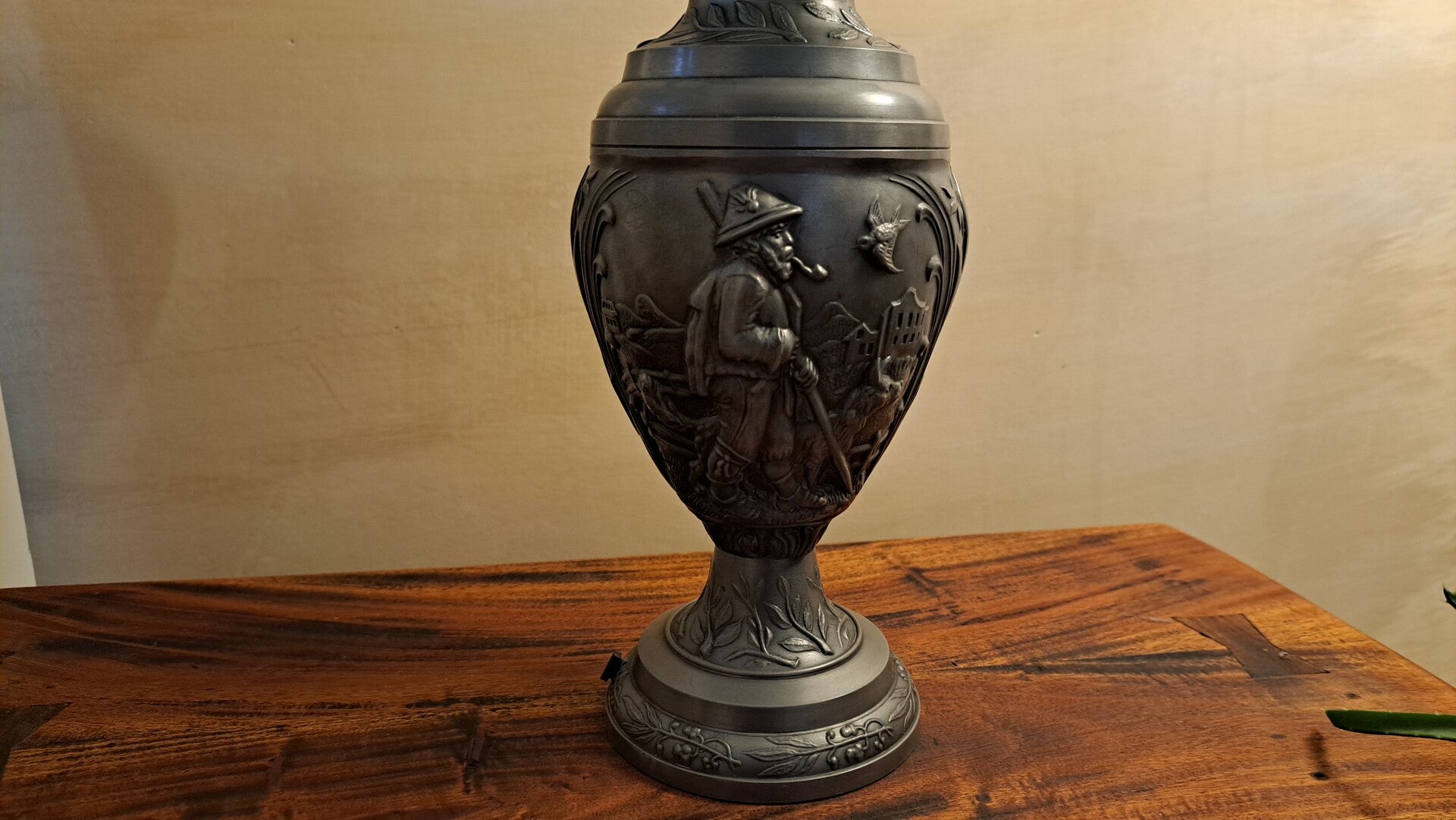 Dit is een klassiek gegoten tinnen voorwerp met reliëfdecoratie, typisch voor decoratief tinwerk uit de 19e of 20e eeuw, vooral uit Duitsland, Oostenrijk of Nederland.
