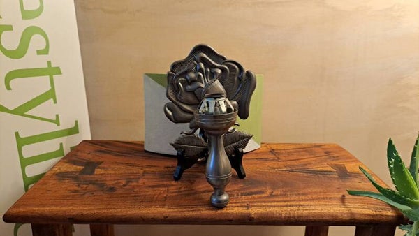 Deze prachtige antieke wandlamp in massief tin is een uniek en sierlijk decoratiestuk. Het rozenornament is fraai gedetailleerd en de lamp wordt geleverd met een gedecoreerde glazen/zonder kap in matte uitvoering. Dankzij de E14 fitting is de lamp eenvoudig elektrisch te gebruiken met elk standaard E14-lampje.