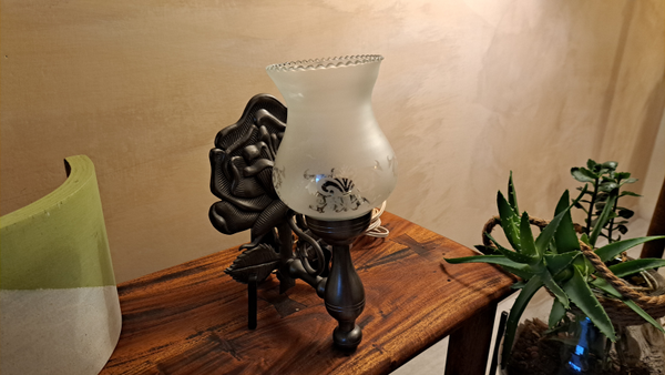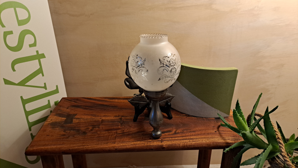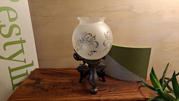Materiaal: Massief tin + originele glazen lampenkap