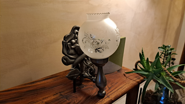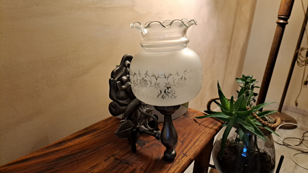 Deze prachtige antieke wandlamp in massief tin is een uniek en sierlijk decoratiestuk. Het rozenornament is fraai gedetailleerd en de lamp wordt geleverd met een gedecoreerde glazen/zonder kap in matte uitvoering. Dankzij de E14 fitting is de lamp eenvoudig elektrisch te gebruiken met elk standaard E14-lampje.