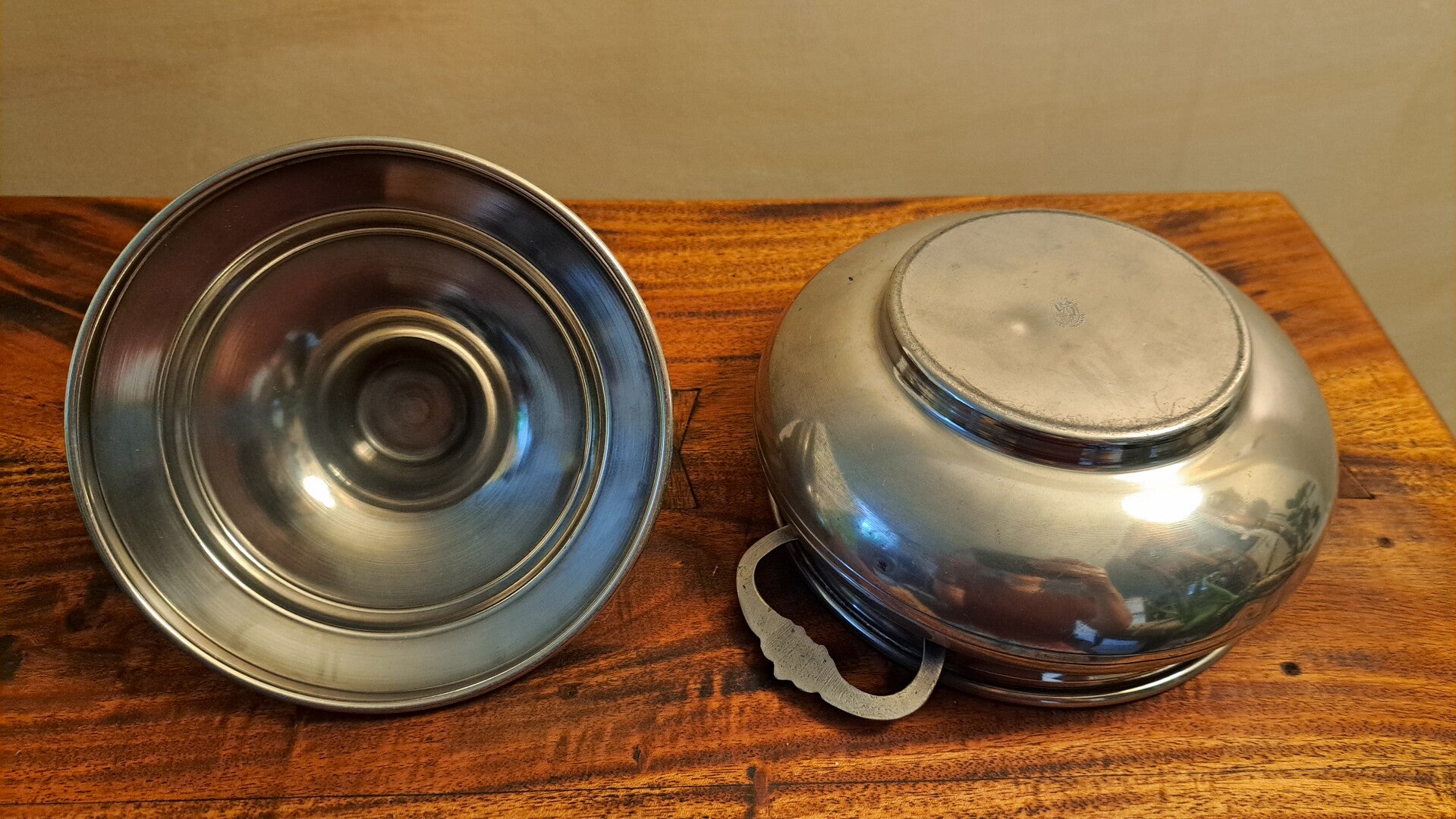 Mooie klassieke vorm, vaste handvatten, sierlijk deksel met eikel-ornament. Verzamelwaardig object met meerdere keurmerken.