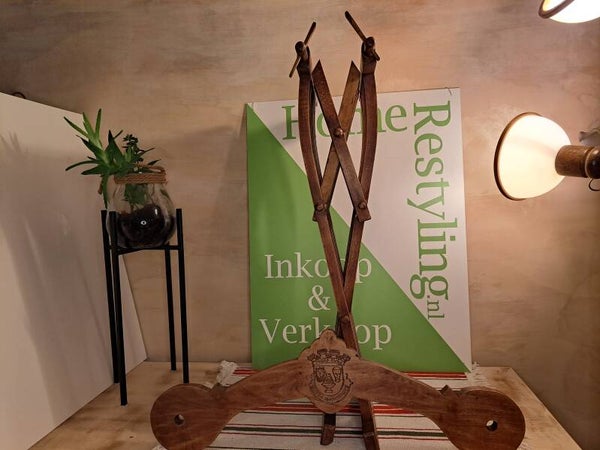 Bijzondere houten Savonarola, ook wel Dagobertstoel genoemd. Dit iconische model staat bekend om zijn karakteristieke X-vormige, inklapbare onderstel en rijk vormgegeven rugleuning.